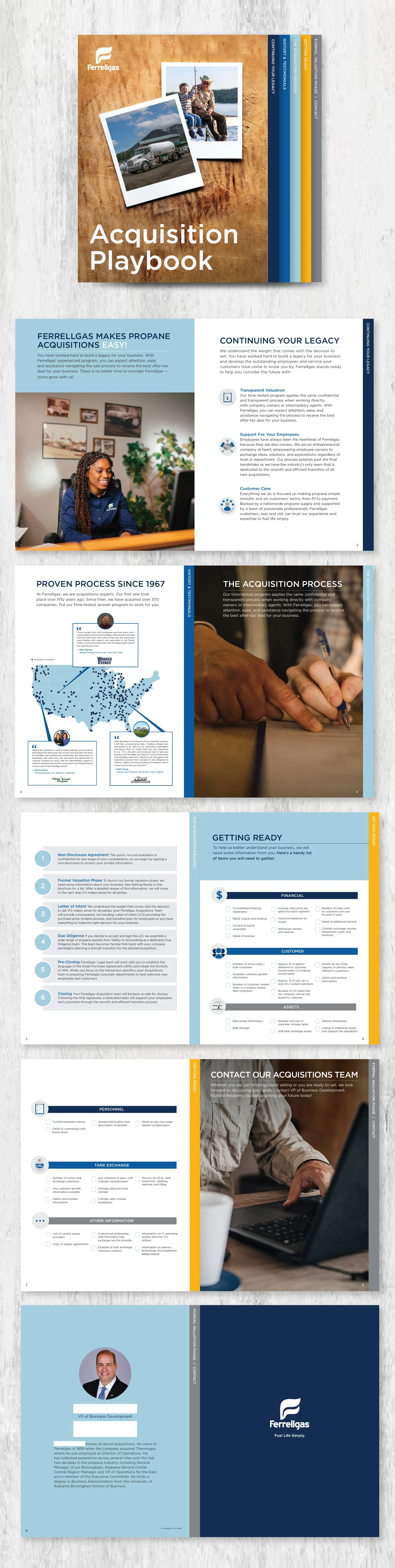 I was the lead designer on an Acquisition Playbook that was sent to propane companies, with the hope they’d transition their business under Ferrellgas’s umbrella. The final piece was a magazine with dividers that step by step walked you through what the acquisition process would look like, and just how easy it is to work with Ferrellgas.